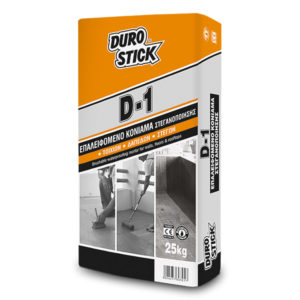 Επαλειφόμενο, τσιμεντοειδές, στεγανοποιητικό κονίαμα που παρουσιάζει άριστη πρόσφυση, στεγανοποιεί πλήρως τις επιφάνειες, χάρη στα πολυμερή και υδαταπωθητικά συστατικά που περιέχει. Το D-1 της DUROSTICK είναι κατάλληλο για θετικές (εξωτερική εφαρμογή, προληπτικά) και αρνητικές (εσωτερική εφαρμογή, για επισκευή) υδροστατικές πιέσεις.