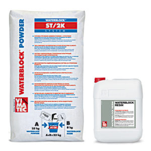 Στο σύστημα WATERBLOCΚ ST/2K η ρητίνη ανάμιξης αντικαθιστά πλήρως το νερό. Έτσι προκύπτει μια άκαμπτη στεγανωτική μεμβράνη με πολύ ισχυρή πρόσφυση, ιδανική για εσωτερική στεγανοποίηση υπογείων (αρνητική επίδραση του νερού).