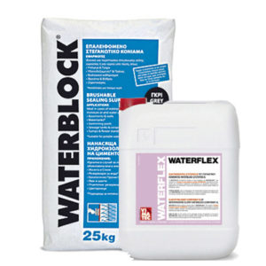 Στο σύστημα FLEXIBLOCK ο ελαστικοποιητής αντικαθιστά πλήρως το νερό ανάμιξης. Έτσι δημιουργείται μια εύκαμπτη στεγανωτική μεμβράνη με εξαιρετική πρόσφυση στο υπόστρωμα. Εφαρμόζεται για εξωτερική ή εσωτερική στεγάνωση υπογείων.